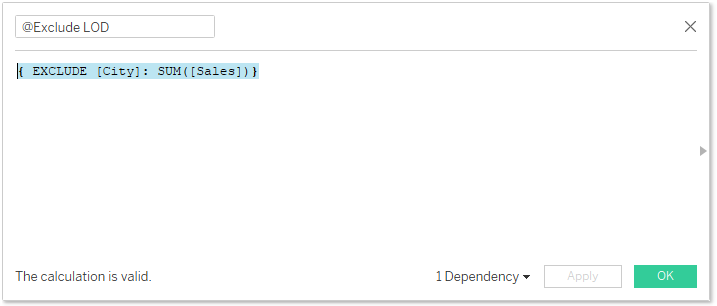 Now imagine that we want to show the Sales in the current view, but exclude a certain Dimension? We will create the following EXCLUDE Level of Detail expression: