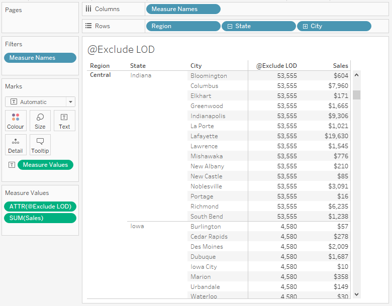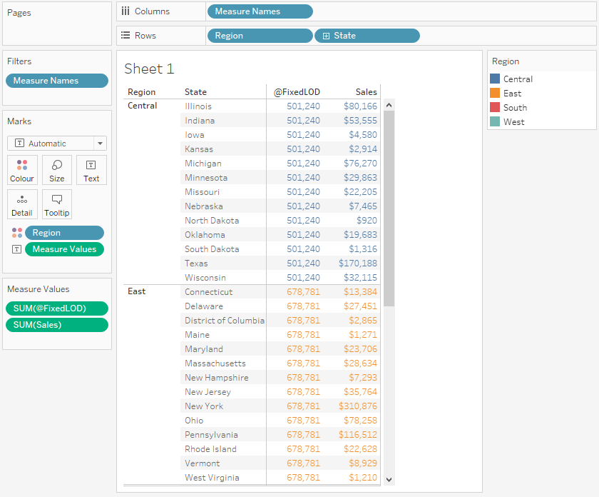 This produces the following view, where you can see that the LOD expression is calculating the Sales at a Region level, whereas the normal Sales measure is calculated at a Region-State level.