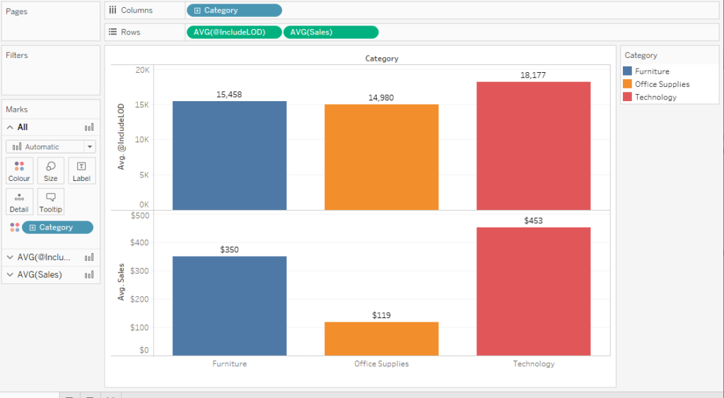 The image below illustrates the difference between the Average(sales) (somewhere between $350 and $4530 per category) and the average sale per State using Include LOD (between $15458 and $18177 per category)