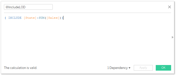 • INCLUDEThis level of detail expressions compute values using the specified dimensions in addition to whatever dimensions are in the view.